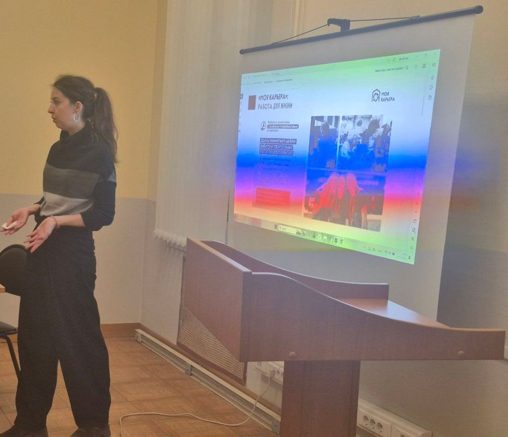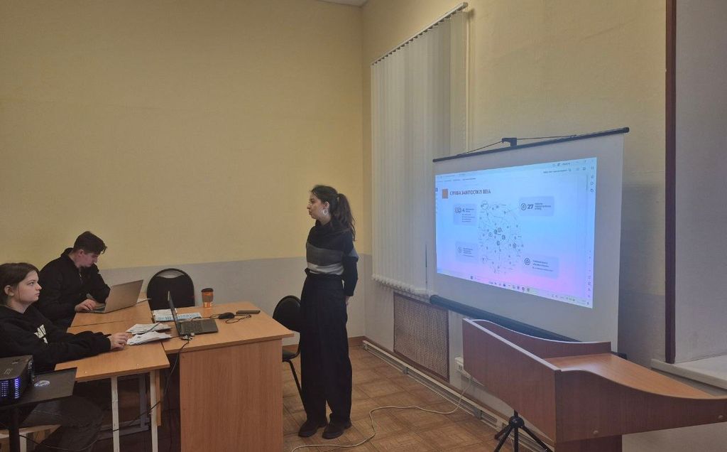 Открыла встречу Н.И. Анфимова, главный специалист отдела партнёрских программ для молодёжи, представитель Центра занятости населения. В своей презентации Надежда Игоревна подробно рассказала о широком спектре мероприятий, проводимых Центром занятости, направленных на поддержку молодых специалистов и соискателей. Особое внимание было уделено работе флагманских центров «Моя карьера», которые предоставляют индивидуальные консультации, профориентационные тесты, мастер-классы и тренинги, помогая молодёжи эффективно ориентироваться на рынке труда и строить успешную профессиональную траекторию. Информация оказалась крайне полезной для студентов, находящихся на пороге выбора своего первого рабочего места или планирующих дальнейшее карьерное развитие.